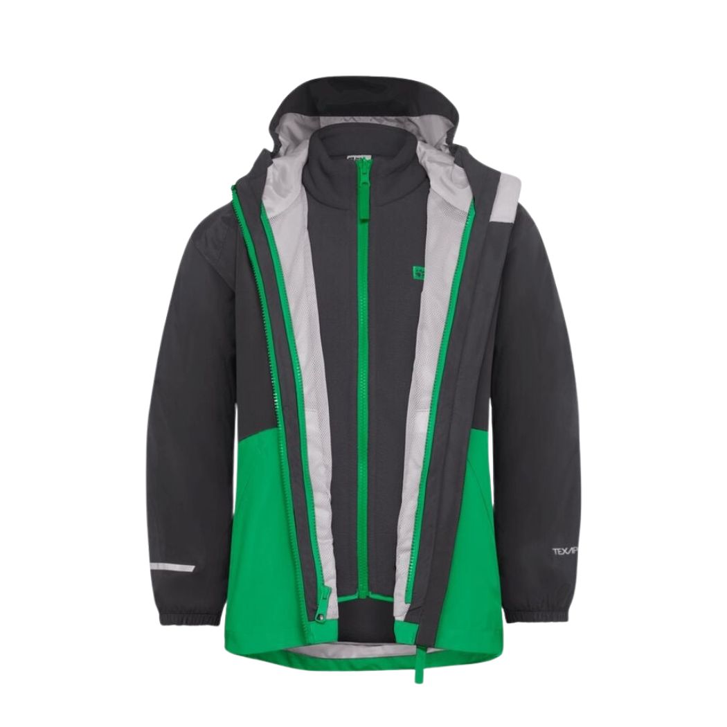 The ICELAND 3IN1 JACKET gives kids options for unpredictable conditions. The inner jacket features MICRO SUEDE WARM LINING and can be worn separately, while the breathable TEXAPORE CORE SOFT TASLAN shell adds waterproof protection. An attached hood offers extra coverage